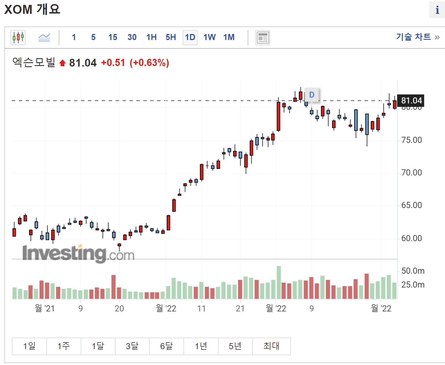 또한, 주요 원자재가격을 한 눈에 볼 수 있는데요. 금, 은, 프렌트유, WTI유, 천연가스, 구리, 미국 옥수수 등의 가격 변화를 바로 볼 수 있어서 유용하게 보고 있습니다. 특히나 요새 석유 가격이 많이 올라서, 브렌트유와 WTI유가 계속 오르고 있어서, 미국 기업중 엑슨모빌이 이에 대한 수혜로 주식 가격이 상승하는 것도 확인할 수 있습니다.